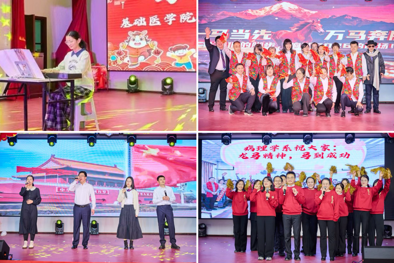 在教学科研、人才培养等领域的丰硕成果,也凝聚了对2026年医学教育创新发展的壮志豪情。节目篇章精彩纷呈,跨界融合亮点纷呈:长春南湖实验中学2025级舞蹈社团的孩子们带来舞蹈《东方红》,以稚嫩身影演绎赤诚初心,用朝气舞姿传递红色力量;组织学与胚胎学、细胞遗传、病原生物学、免疫、三综合学系的老师们联袂呈现的《中国龙》,刚劲动作与昂扬气势尽显中华儿女的精神图腾,赢得全场阵阵喝彩;生理学系的宋浩天、王迦南合唱一曲《时差》,温柔旋律承载细腻情感,让观众沉浸在音符编织的温情世界;教工第一党支部带来的《疯狂动物城》歌舞表演,重现动画里的热血欢乐,展现了教职工队伍的多元风采与蓬勃活力。