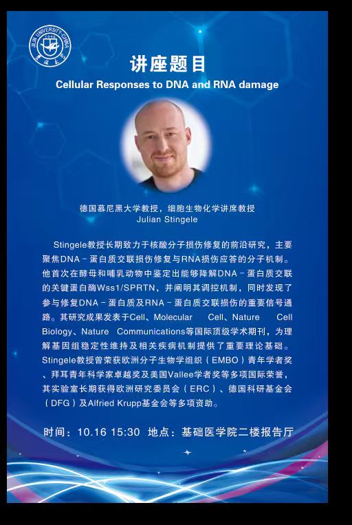 讲座嘉宾:Julian Stingele ,德国慕尼黑大学教授,细胞生物化学讲席教授